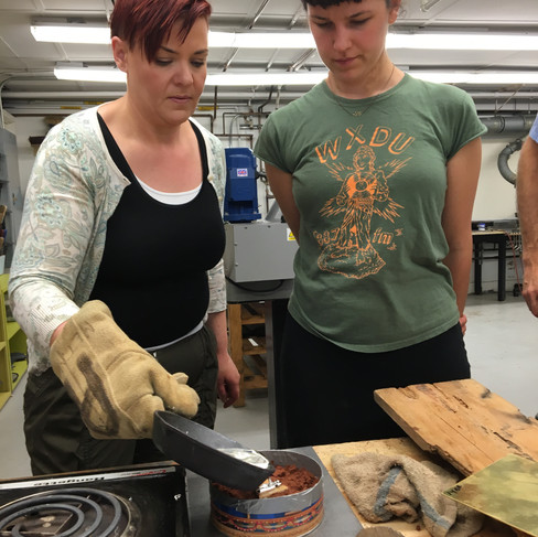 Yesterday the fabulous Ray Duffey the wood instructor here at Penland stopped by with his students for a demo in pewter casting. Having previously experimented with pouring directly into wood I thought they might see potential for their work. I LOVE collaborations and enjoy when other artists and students get as excited as I do about material possibilities. Looking forward to seeing the results!